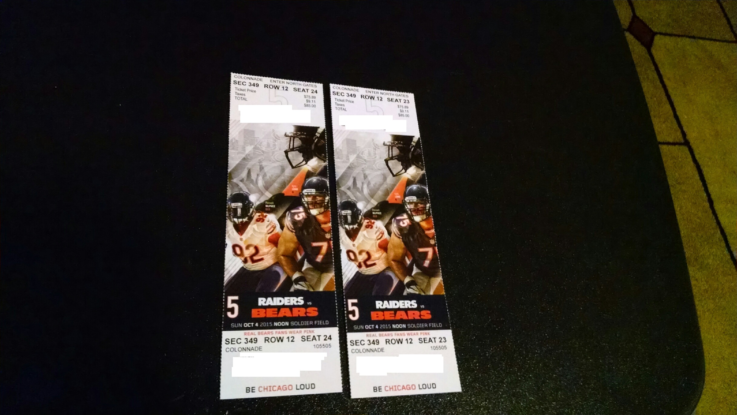 As you see in the picture, I am selling my Bears/Raiders tickets for this Sunday. These are part of my season tickets and since the Bears suck, I have been selling off the rest of the season’s home games. I already sold the remaining home games later in the year. That’s what happens when the Bears torture you. I can’t take the pain anymore. It’s time for someone else to feel the misery.