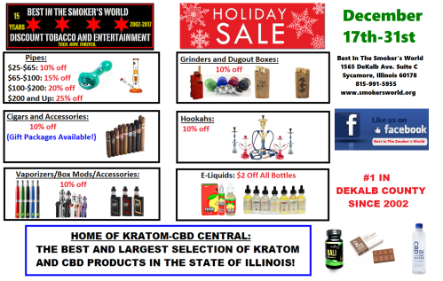 Live outside the area? Don’t worry. We give free shipping. Want a pipe? Grinder? Vaporizer? Kratom? Give us a call at 815-991-5955 to make your order. See you all soon.