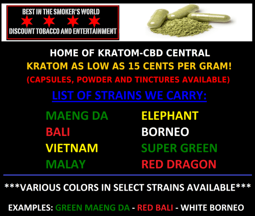 View the video posted here to see what a prominent attorney in Florida says about the government’s mission to take away this plant that can possibly help others live better lives. We have the best and largest selection for Kratom in the state of Illinois. Come see why many have said hello to Kratom at Best In The Smoker’s World over all of these years. We offer free shipping to 46 states. Give us a call at 815-991-5955 to make an order.
