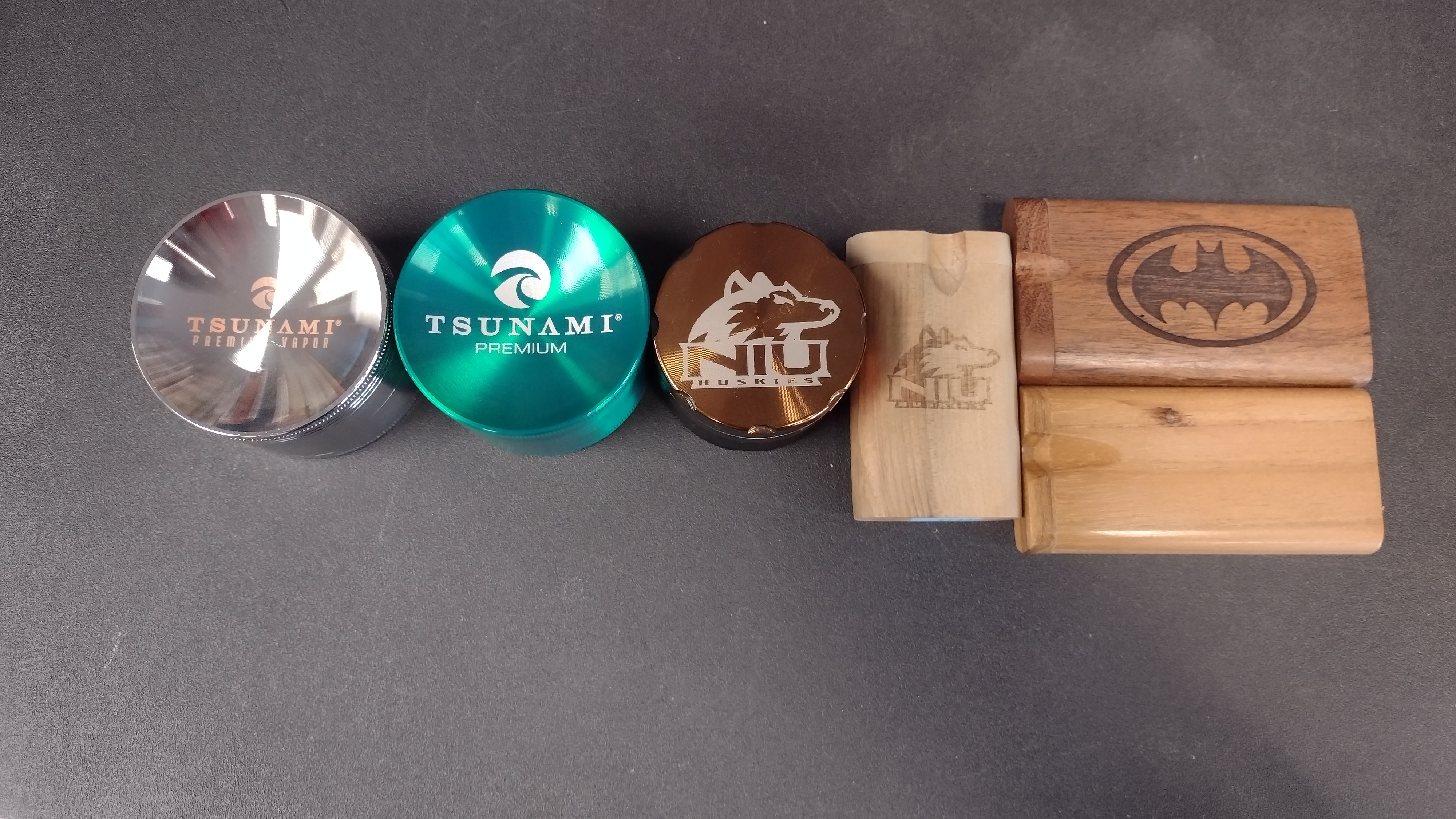 Here are just some of the hitter boxes and grinders we carry. All boxes come with a metal hitter. We also have glass hitters you can buy separately that will fit in them. For grinders, we have brand names such as Tsunami and Wulf. These ones are heavy duty and long lasting. We have types for all budgets.