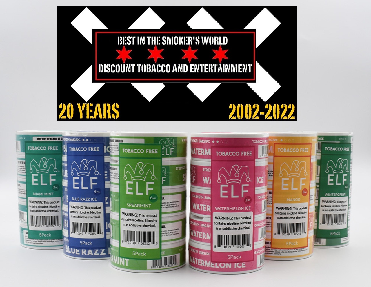 We have the Elf brand of nicotine pouches. The available nicotine levels are 3 and 6. The flavors are Blue Razz Ice, Watermelon Ice, Mango and Spearmint. The price is $1 cheaper at $3.99 a tin.